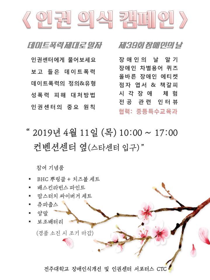 | 3 | [캠페인]2019 인권센터와 장애학생지원센터, 연합 캠페인 진행 | 인권센터 | 19-04-11 | 899 |